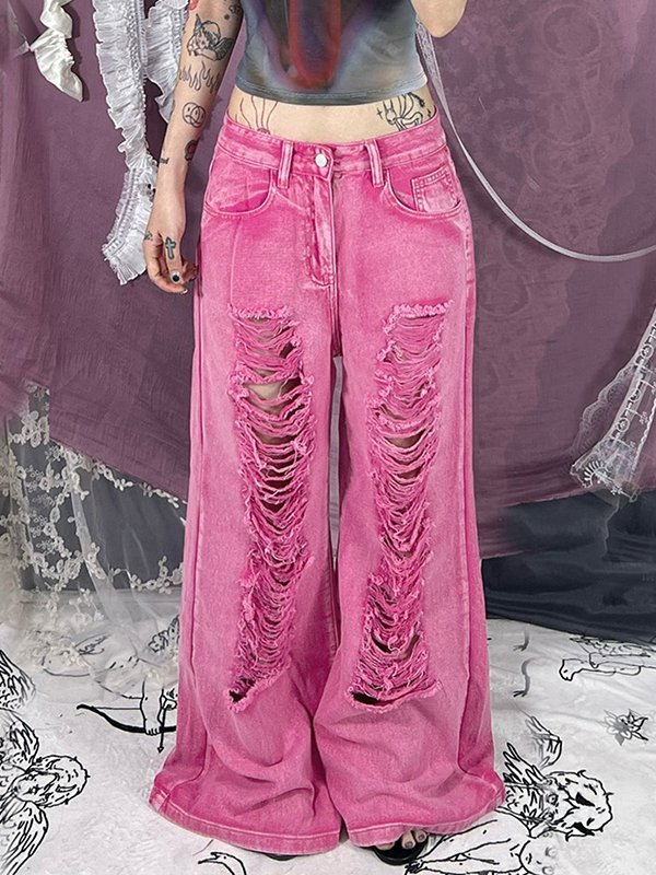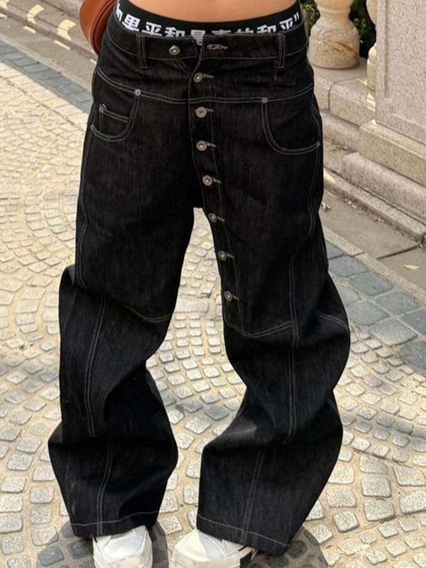Vaqueros holgados de mezclilla lavada con estampado de encaje 3D falso y costuras laterales