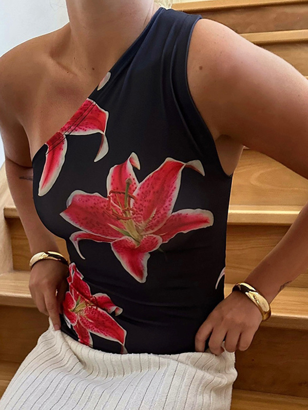 Camiseta sin mangas con cuello inclinado y un hombro con estampado de lirios